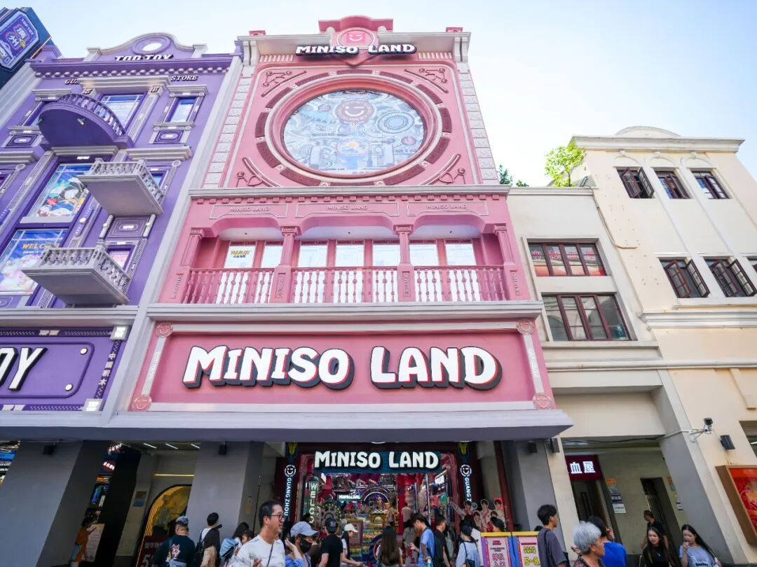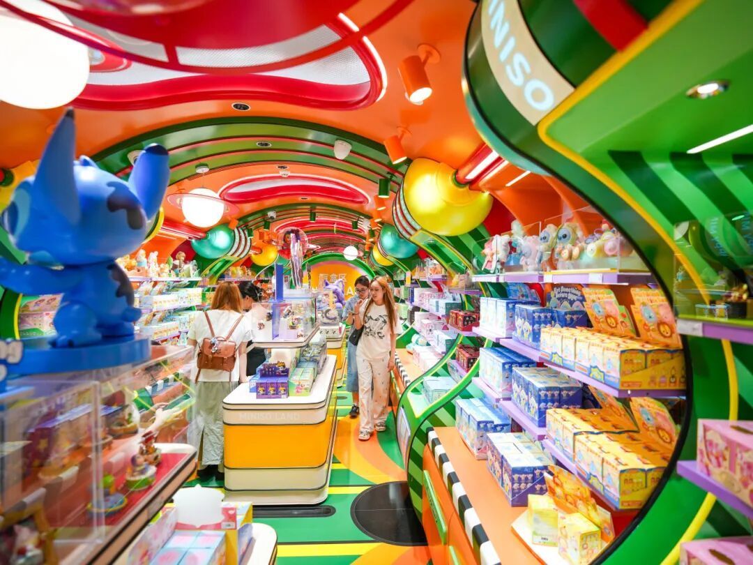 MINISO LAND结合岭南传统骑楼三段式建筑风貌与潮玩艺术装置,设计打造广东首家“文创、IP、零售、乐园”相结合的全新店态,目前店内已汇集5500个SKU、超100种IP产品,IP产品占比近90%,构建起完整的潮玩生态矩阵。