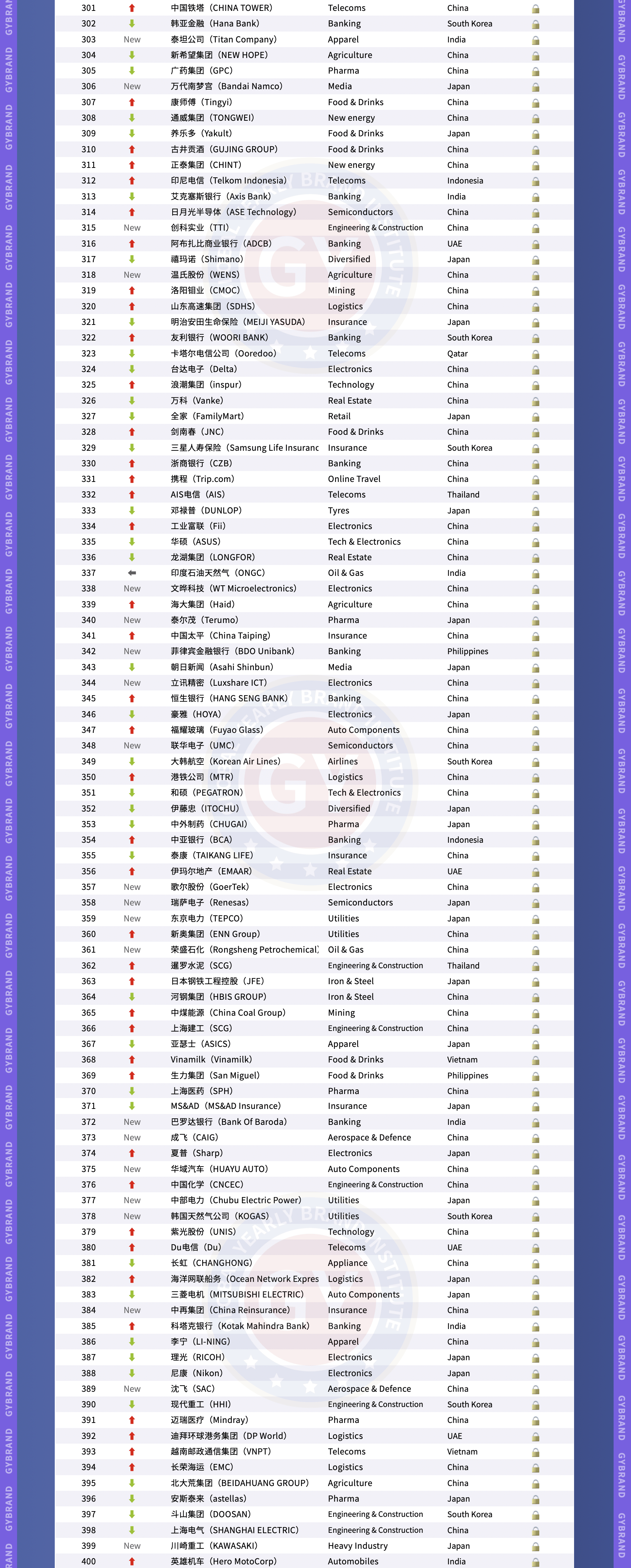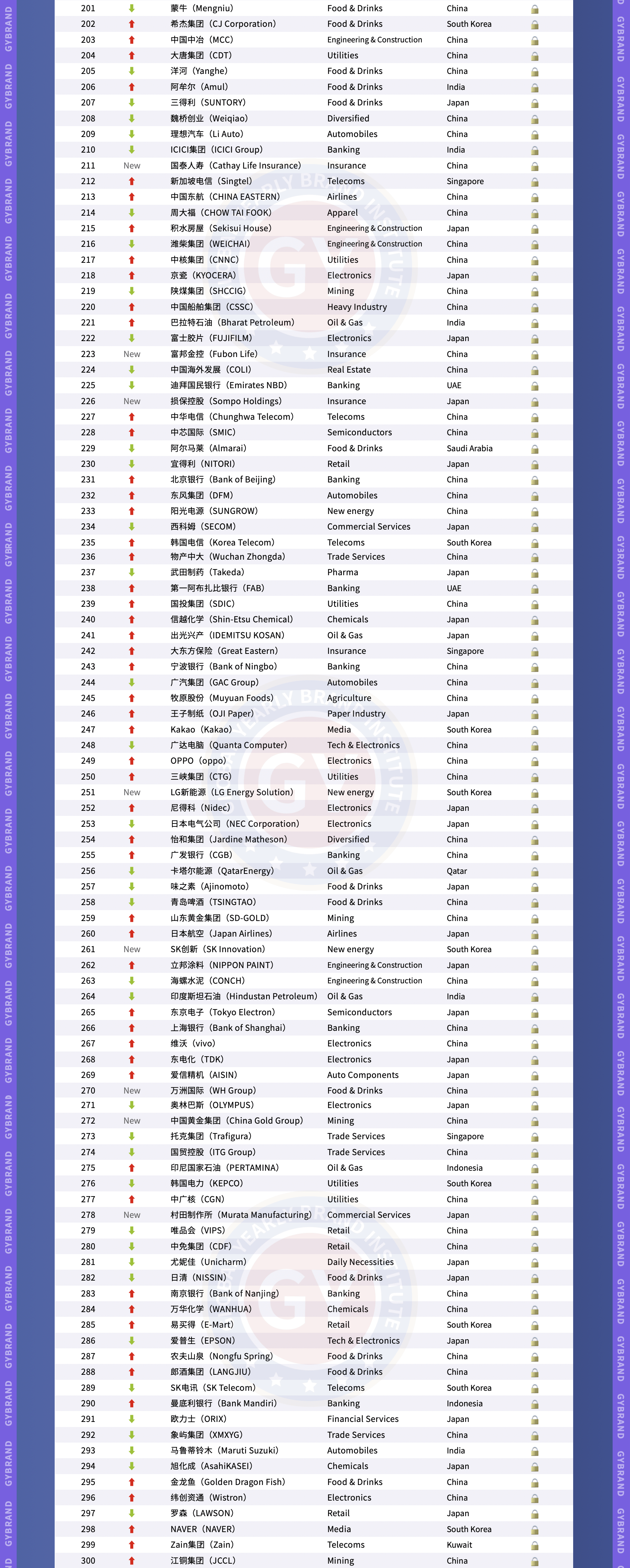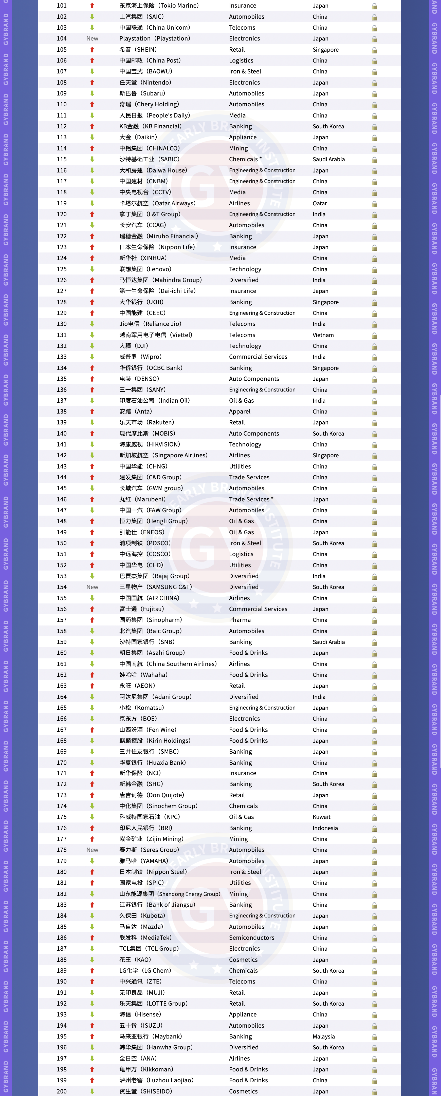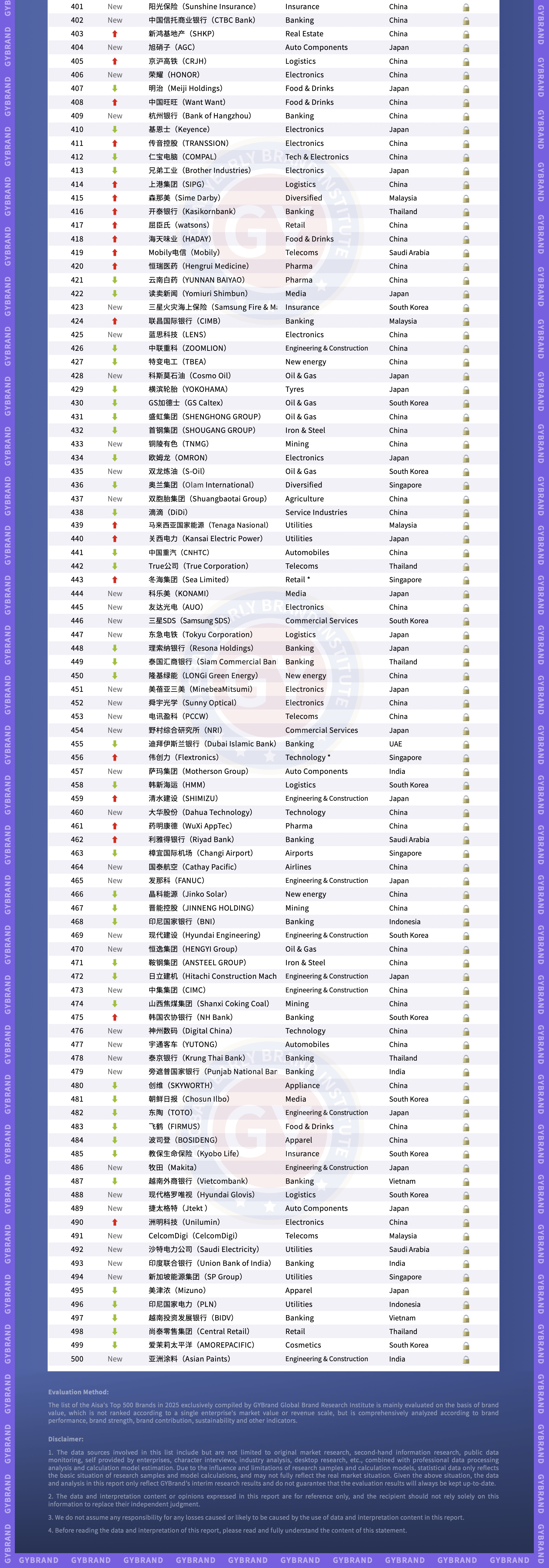 在GYBrand首席分析师金良鑫表示:“当今世界百年未有之大变局加速演进,中国企业在科技创新前沿领域取得了一系列突破性成果,并加快推进新型工业化,培育壮大先进制造业集群,推动制造业高端化、智能化、绿色化发展。而在战略性新兴产业领域正处于抢占制高点、向更高位跃升的重要关口,引领着全球科技革命和产业变革的方向,新一代信息技术、半导体、新能源、新材料、高端装备发展潜力巨大,未来或有更多中国企业跻身GYBrand亚洲品牌价值500强榜单。”