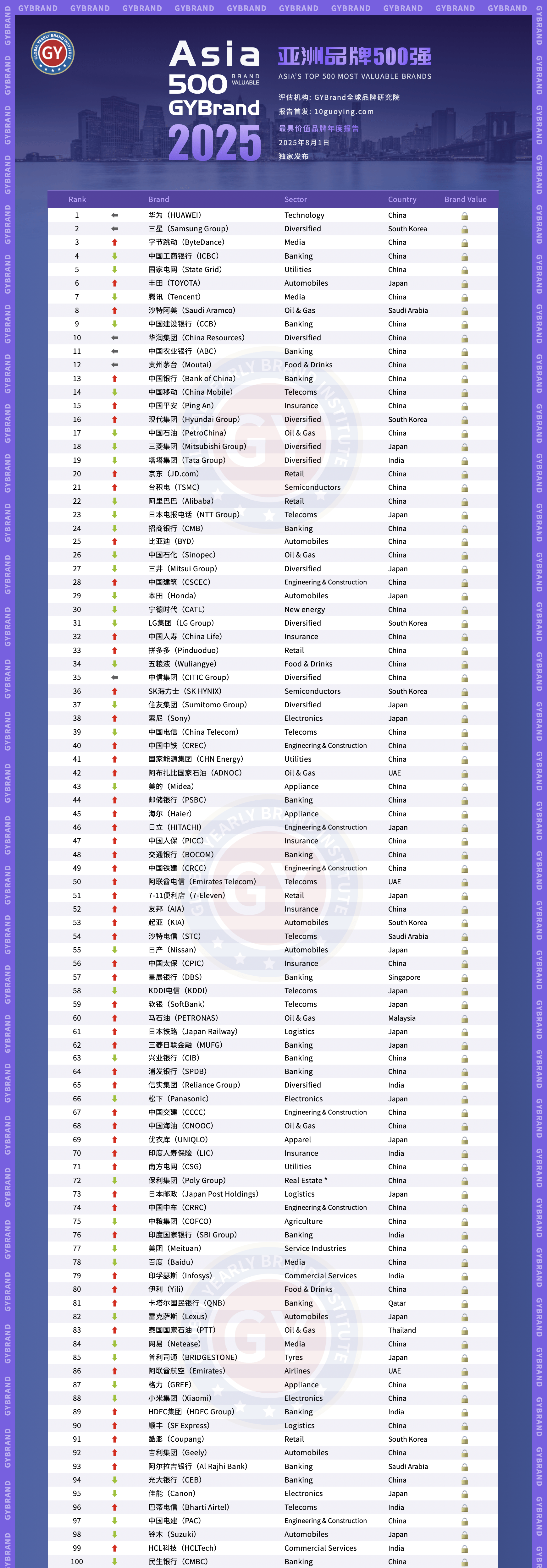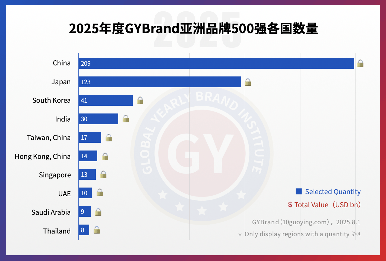 8月1日,GYBrand全球品牌研究院独家编制的2025年度亚洲品牌500强排行榜正式发布。这是一份全面展示亚洲各行业龙头企业品牌建设最新成果的榜单,主要评估依据是品牌价值股票网上配资平,并不是简单按照企业市值或营收规模排序,而是从财务业绩、品牌强度、品牌贡献、可持续性等多个维度进行综合分析。来自16个国家及地区的500家企业入选今年的亚洲品牌500强名单,中日韩合计404家企业入选,占了总榜单的80.8%。