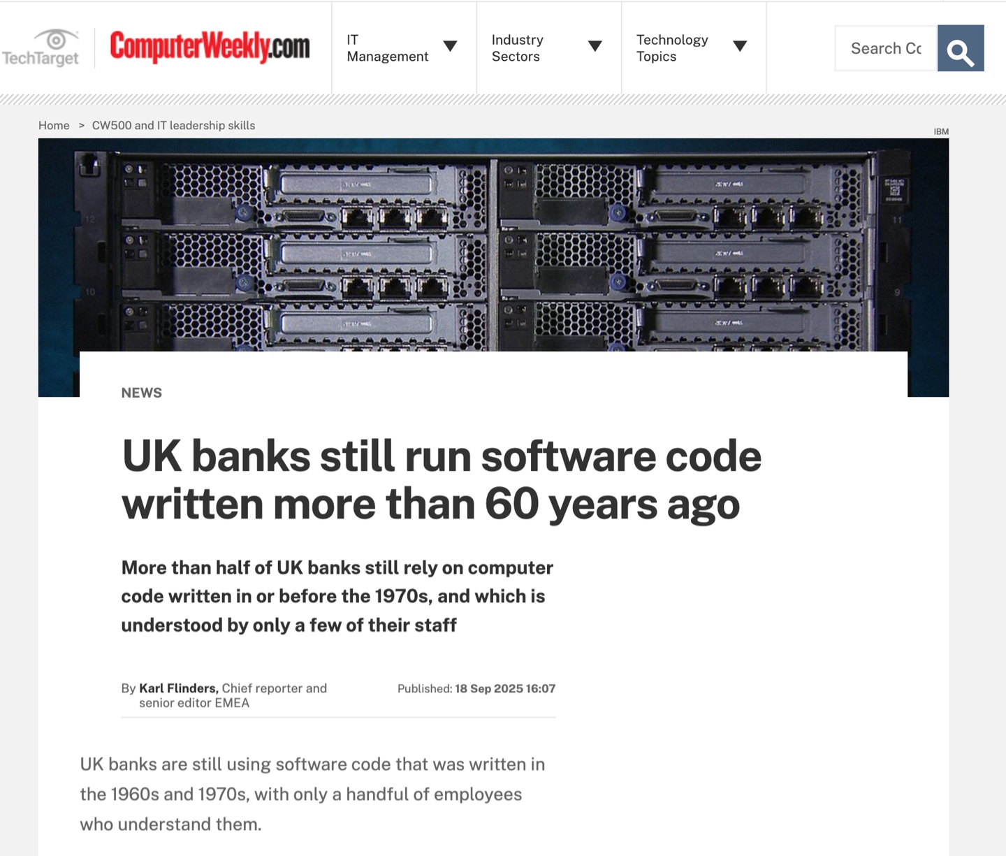 Baringa 的一项调查显示,在接受调研的 200 家英国银行中,16% 依赖 60 年代的软件,近 40% 仍在维护 70 年代的代码。半数银行承认,能理解这些系统的只有一两名员工,而且多已接近退休。另有 31.5% 的银行则依赖一两名尚未退休的员工来维持遗留系统运转。