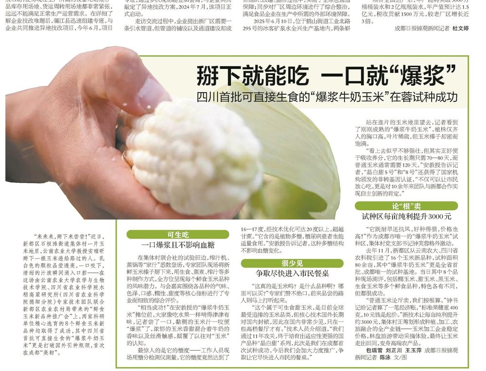 据悉,该品种耗时11年攻关培育,因乳白色被称为“牛奶玉米”,其糖度最高可达20度以上,甚至超越甘蔗。集体村党支部书记钟芙蓉称,去年11月,引进16个玉米新品种,试种面积达80余亩。“‘牛奶玉米’试种,让村子成为全省首批、成都唯一的试种基地。”
